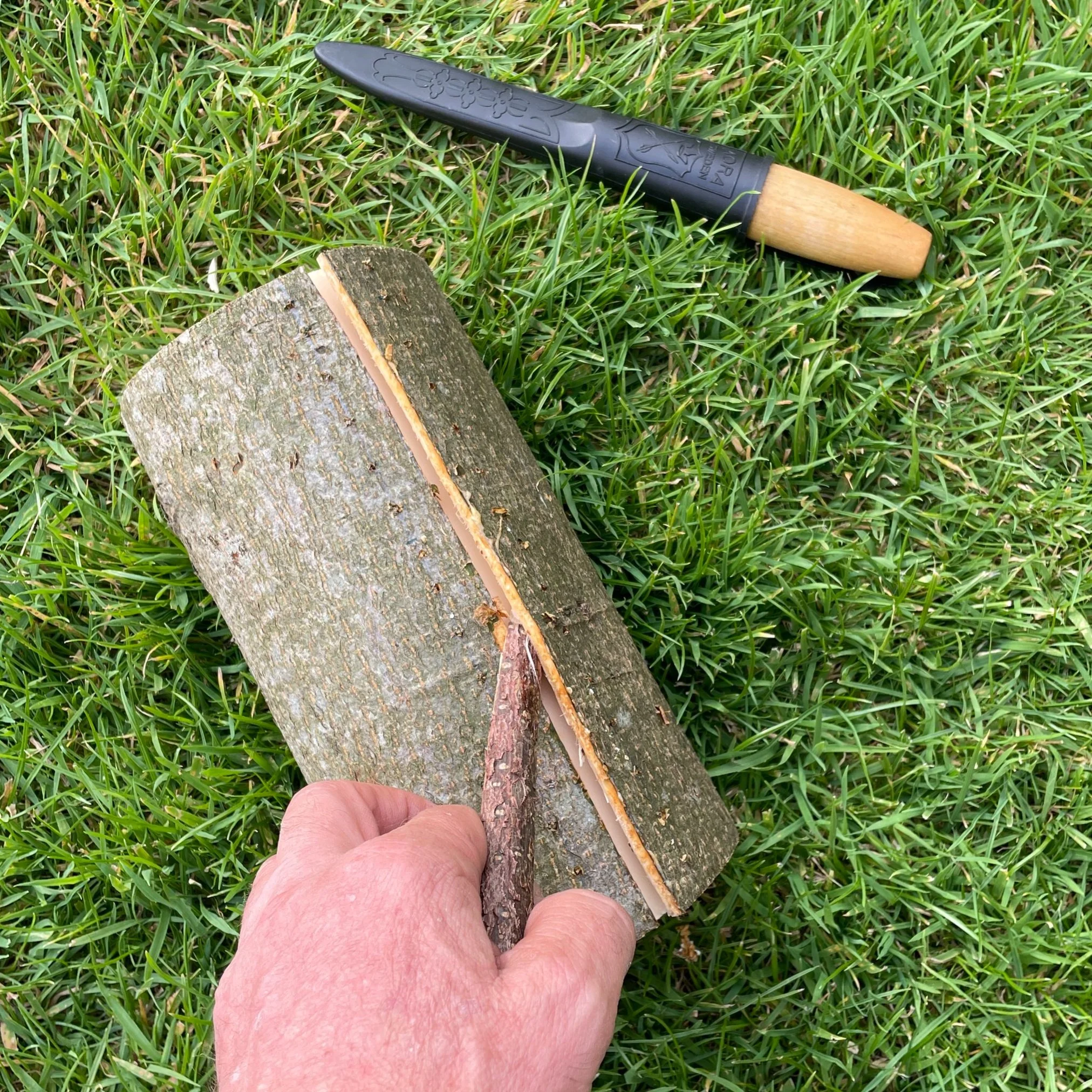 Make a chisel tip on your thin stick. With your knife, carefully score the cut line the full depth of the bark. This should be fairly straight forward as the bark is quite soft. Ease the edge of the bark away from the inner core and slide your chisel stick in. Work it along the edge being careful not to damage the bark (image 2 below).